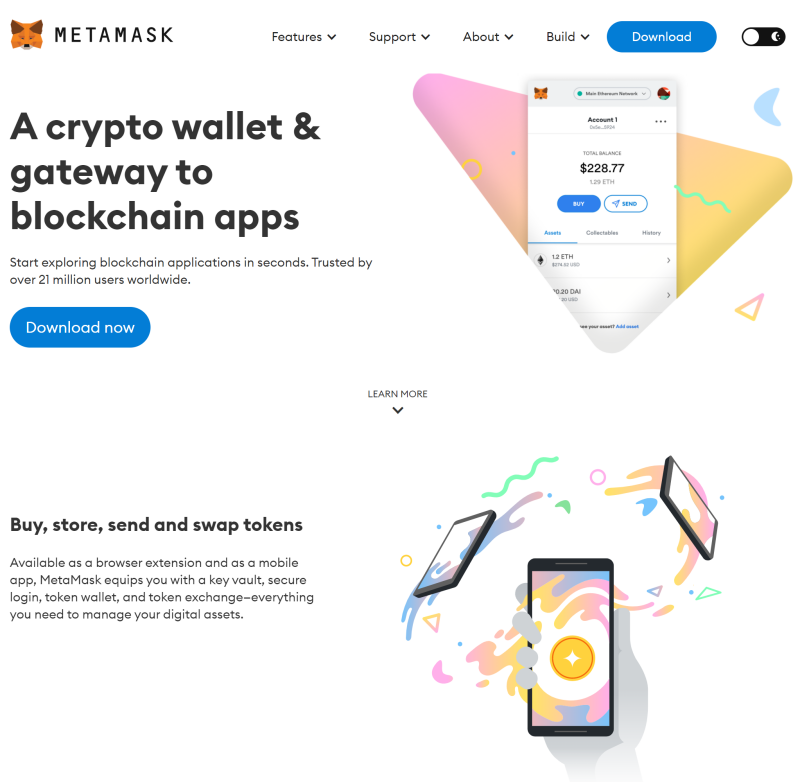 Besides supporting cryptocurrencies, MetaMask is a versatile product in the marketplace, supporting tokens on the ERC-20 protocol, and storing non-fungible tokens (NFTs) which can be connected with marketplaces such as OpenSea.2 The wallet also supports multiple blockchains including the Build and Build (BNB) chain, Polygon, Avalanche, and more.